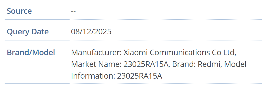 Außerdem hatte Xiaomi das Gerät ursprünglich für eine breite regionale Markteinführung geplant, einschließlich Global, EEA, Türkei, Indonesien, Taiwan, Russland und China. In der GSMA-Datenbank wurde jedoch nur eine Modellnummer, 23025RA15A, erfasst, wobei der Regionalcode „A“ auf den globalen Markt hinweist.