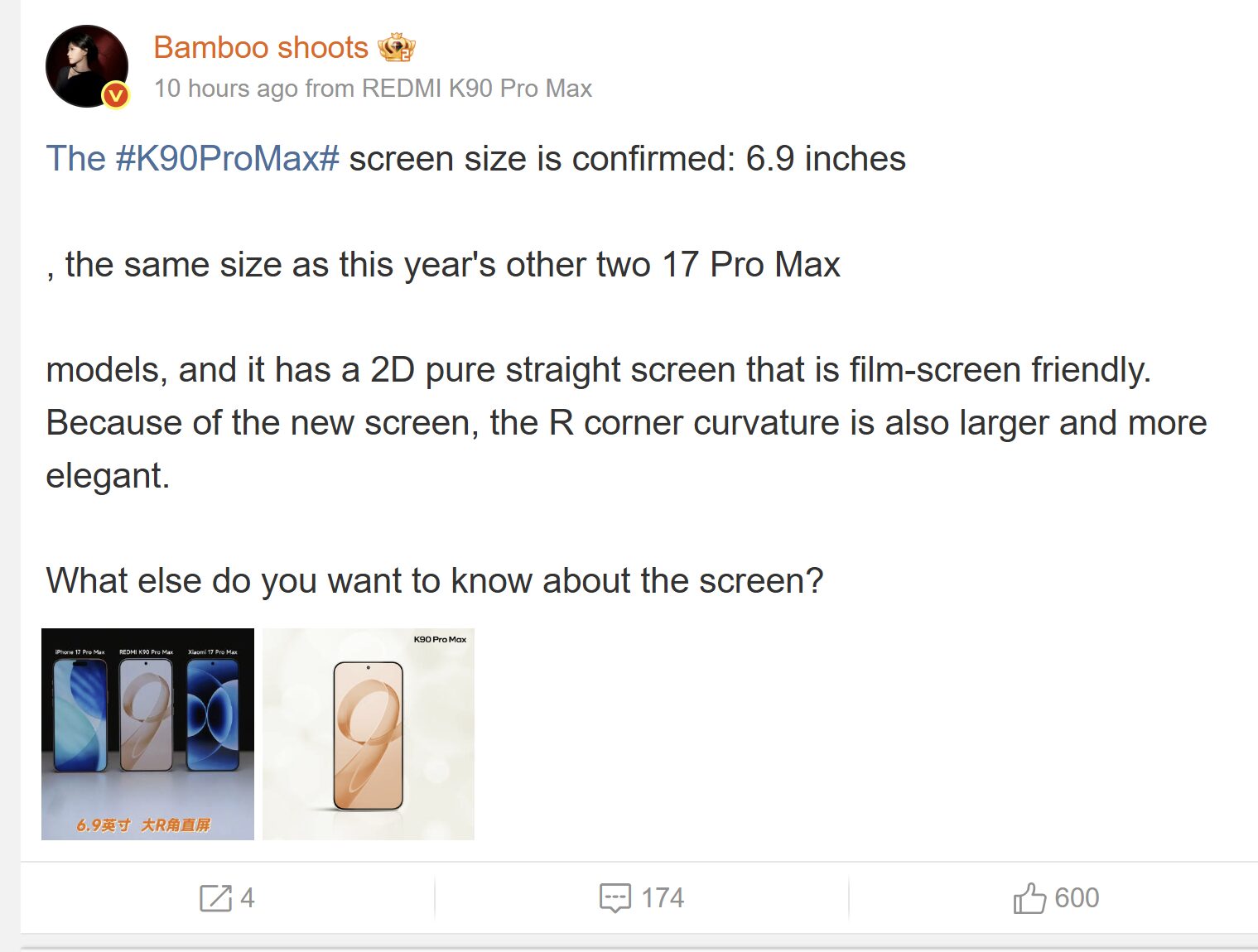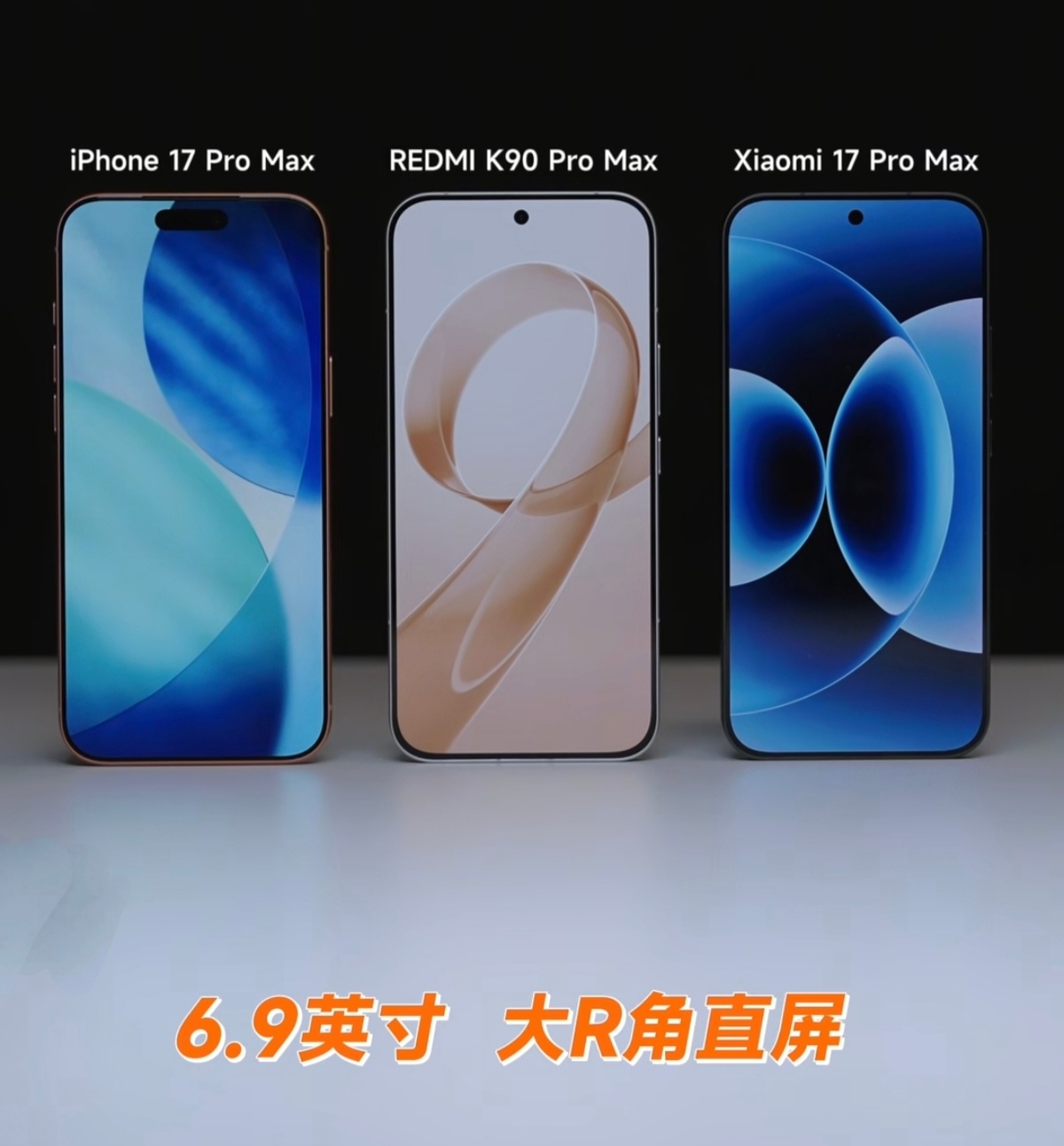 Mit dem K90 Pro Max setzt Redmi noch einen drauf: Es ist genauso groß wie das 6,9-Zoll-Flachdisplay des iPhone 17 Pro Max. Xiaomis Redmi-Produktmanager Sun Cun bestätigte die Spezifikationen – das K90 Pro Max gehört damit zu den größten Geräten der Redmi-Reihe und verfügt über die charakteristischen geschwungenen R-Winkel-Ecken, die für einen polierten, professionellen Look sorgen.