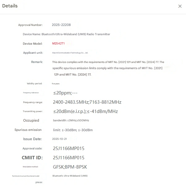 Ein neues Xiaomi Wearable Device mit unbekannter Technologie ist online aufgetaucht. Dieses Gerät hat die offizielle MIIT-Zulassung für offizielle chinesische Mitteilungen über Hardware-Cybersicherheit erhalten. Dieses Gerät hat ein Gegenstück mit der Referenznummer M2542T1, mit der es die Technologie Ultra-WideBand unterstützt. Obwohl das Unternehmen nichts über das Design oder den Namen dieses Geräts verraten hat, ist es ein weiterer Neuzugang in der Gruppe der UWB-Smart Devices von Xiaomi. Mit dieser Reihe von UWB-Geräten hat Xiaomi seine Smart Device-Familie um ein weiteres Gerät erweitert.