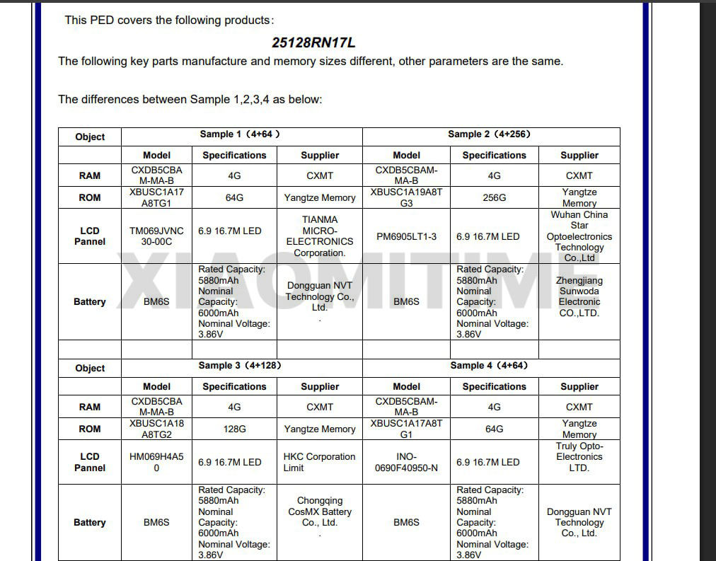 Die Details zu den Kameras scheinen noch nicht bestätigt zu sein, aber die Zertifizierungsinformationen deuten auf eine einzelne Hauptkamera, 13 MP- oder 50 MP-KI-Kameras hin, wie sie für Einsteiger-Smartphones typisch sind. Als interner Speicher stehen 64 GB und 128 GB mit eMMC 5.1 oder UFS 2.2 Flash zur Verfügung .