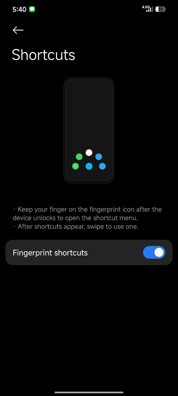 Wenn diese Funktion aktiviert ist, musst du deinen Finger nach dem Entsperren des Geräts nicht sofort anheben. Stattdessen hältst du deinen Finger auf dem Sensorbereich und es erscheint ein Schiebe-Menü, in dem du deinen Finger ziehen kannst, um bestimmte Apps sofort zu starten.