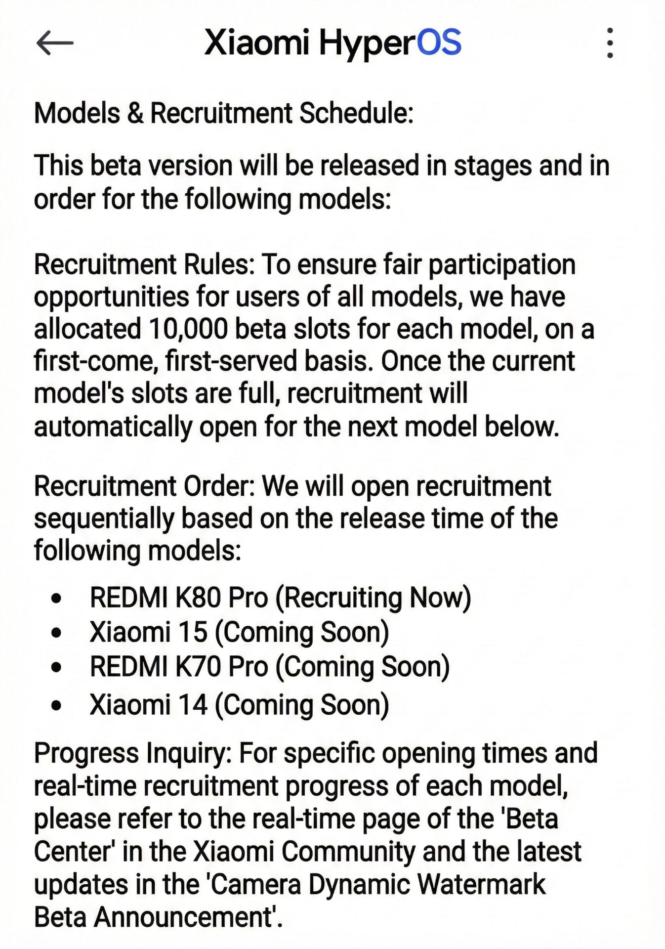 Derzeit werden mehrere High-Range-Handys aus Xiaomis Produktpalette rekrutiert. Für das REDMI K80 Ultra sind derzeit Bewerbungen möglich, für das Xiaomi 15, das REDMI K70 Ultra und das Xiaomi 14 sollten die Plätze bald frei sein. Es gibt eine Obergrenze von 10.000 Teilnehmern, damit die Testumgebung auf jedem Gerät organisiert bleibt. Die Bewerber/innen können ihren Status im internen Testcenter in der offiziellen Xiaomi Community Anwendung einsehen.