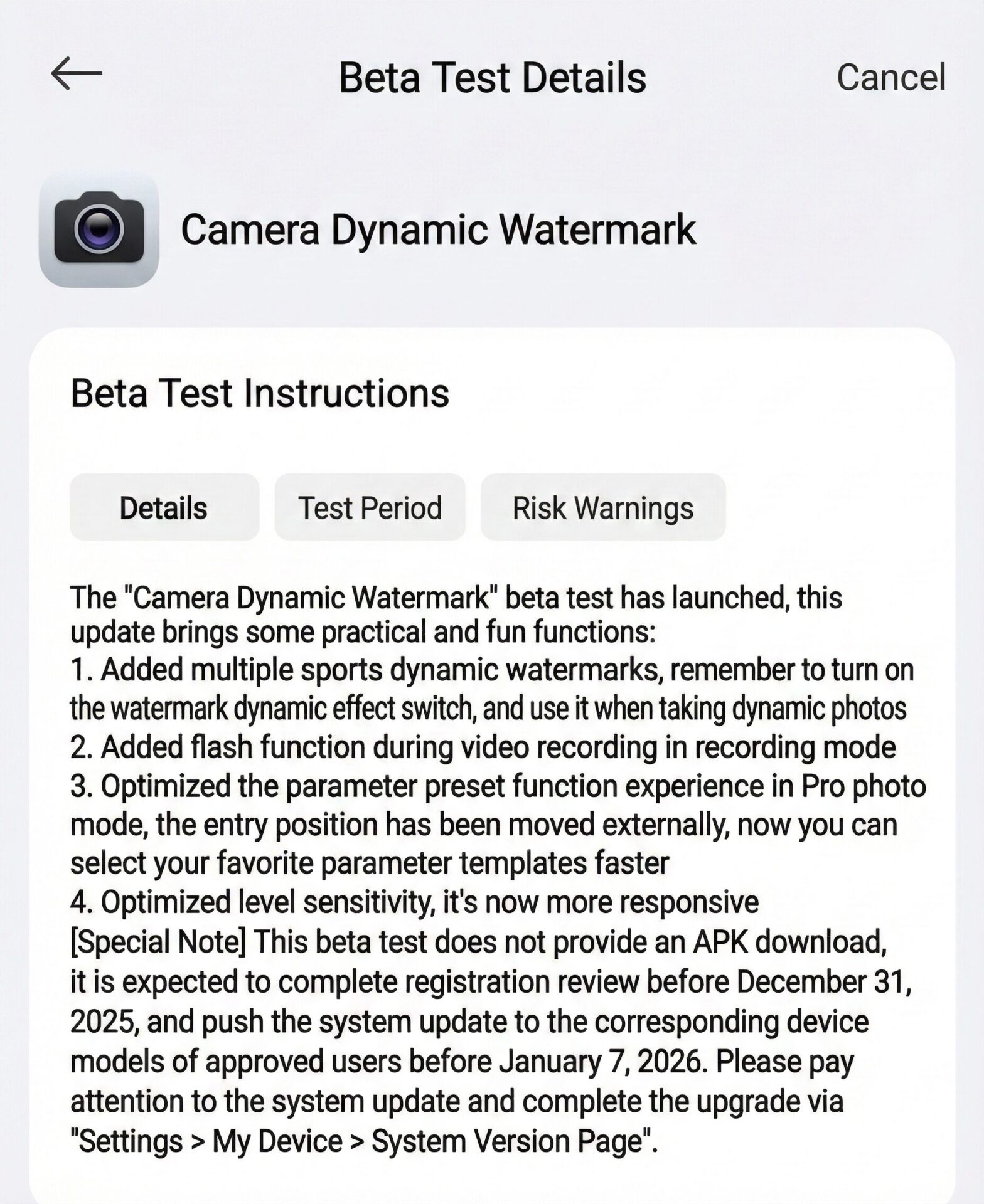 Die Anmeldefrist für die Beta-Version von Camera Dynamic Watermark endet am 31. Dezember 2025. Ausgewählte Nutzer/innen werden ab dem 7. Januar 2026 System-Updates erhalten. Dabei handelt es sich um ein routinemäßiges System-OTA-Update, nicht um einen einzelnen APK-Download. Um das Update zu installieren, müssen die Nutzer/innen in die Einstellungen gehen, auf „Über das Telefon“ klicken und auf das Aktualisierungssymbol neben der Systemversion tippen, um nach dem neuesten Paket zu suchen.