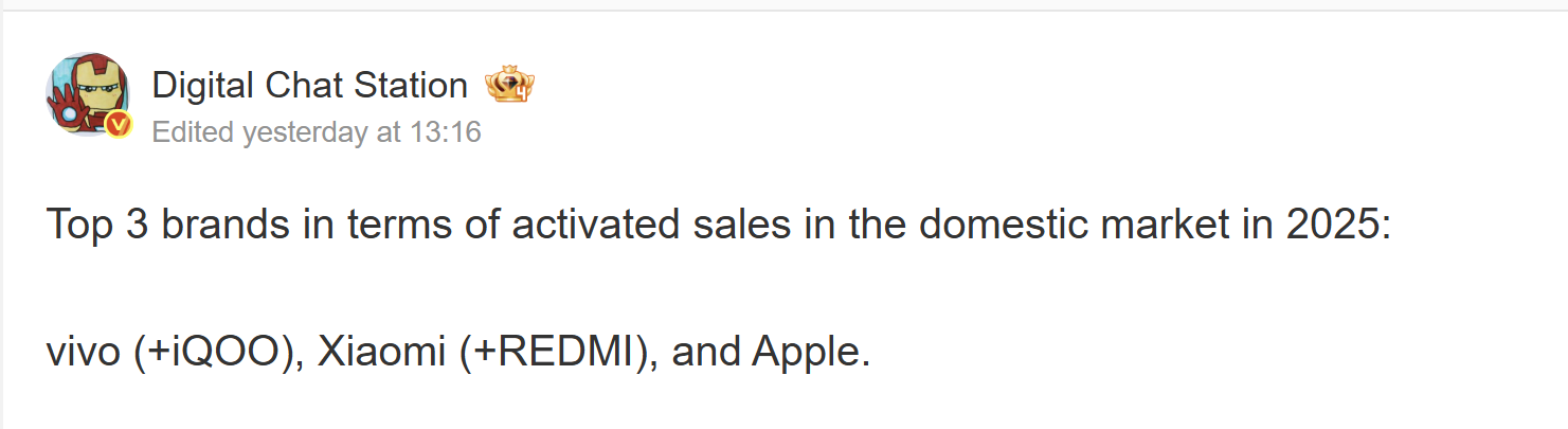 Laut den Brancheninformationen, die von glaubwürdigen Quellen wie Digital Chat Station geteilt werden, scheint der Wettbewerb im vergangenen Jahr sehr hart gewesen zu sein. Die ersten drei Unternehmen in der Liste – vivo, Xiaomi und Apple – konnten alle die 40-Millionen-Aktivierungsgrenze durchbrechen. Die verfügbaren Daten zeigen, dass der Unterschied zwischen der ersten und der zweiten Marke mit 200.000 bis 300.000 Einheiten sehr gering ist.